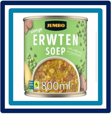 Water, spliterwten 22,5%, rookworst 10,8% (varkensvlees Beter Leven 1 ster 7,9%, water, varkenscollageen Beter Leven 1 ster, varkenseiwit, zout, stabilisator: E450, zuurteregelaar: E575, verdikkingsmiddel: E466, voedingszuur: citroenzuur, maltodextrine, rookaroma, antioxidant: E301, conserveermiddel: E250, specerijenextract [gember, zwarte peper, capsicum, koriander], rook), aardappel 4,7%, wortel 4,3%, erwtenpuree 4%, erwten 3,6%, prei 3,2%, ui 2,2%, selderijblad, gemodificeerd maïszetmeel, raapzaadolie, zout, natuurlijk aroma (selderij), gehydrolyseerd eiwit (maïs, zonnebloem), gehydrolyseerd raapzaadeiwit, witte peper, rookaroma, E = door EU goedgekeurde hulpstof.